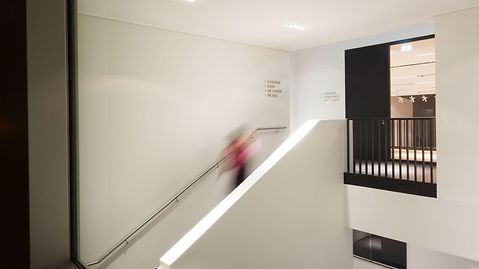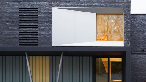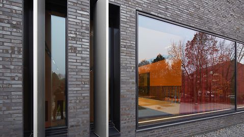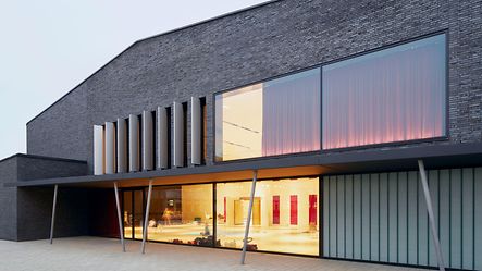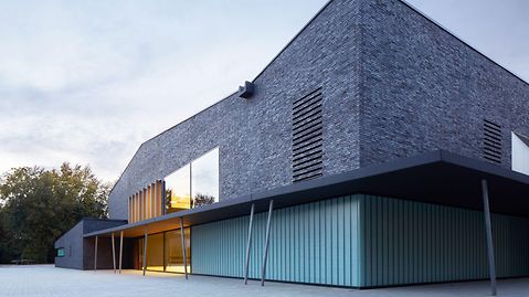 The old sports hall at the district school in Bergedorf was severely damaged by a fire in 2009 and subsequently had to be demolished. The exterior of the new building opened in 2012 is characterised by dynamically modulated roof edges, asymmetrically positioned areas of glass, as well as a dark, irregular, relief-style clinker brick façade. Inside the sports hall, the colours green, blue and red are predominant. The translucent glazing at the side with Schüco FW 50+.HI provides natural daylight without any glare. Designed in black and white, the cultural space is flooded with daylight by the Schüco FW 50+.HI system.