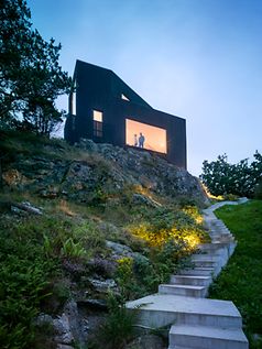 The building envelope is made from dark-painted wood which, when viewed from the sea, blends in with the mountain in the background. However, if you move closer to the house, the picture changes: the building stands clearly visible on a hilltop and looks like a large rock.