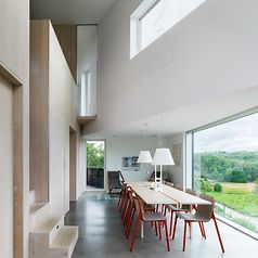 There is a particularly impressive view through the panoramic window (Schüco FW 50+), which dominates the main side towards the water. This opening provides constant, pleasant daylight to the living and dining area measuring 12 m2 and, in some places, 5.5 m high. The void and the windows make the space seem larger.