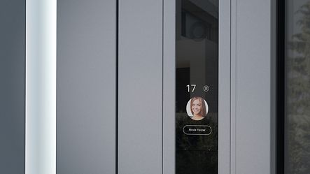 L'écran tactile Schüco DCS SmartTouch indique le numéro de votre maison. Dès qu'il détecte une présence à proximité de la porte d'entrée, il affiche la plaque de la sonnette ou la liste alphabétique des habitants d'un bâtiment collectif, à faire défiler avec le doigt comme sur un Smartphone. Il permet l'accès par saisie du code personnel, ou un déverrouillage contrôlé à distance par Smartphone en profitant du son et de l'image. DCS SmartTouch est intégré et affleurant dans le montant de la porte (série 75), avec une superbe finition miroir ou Aluminium.