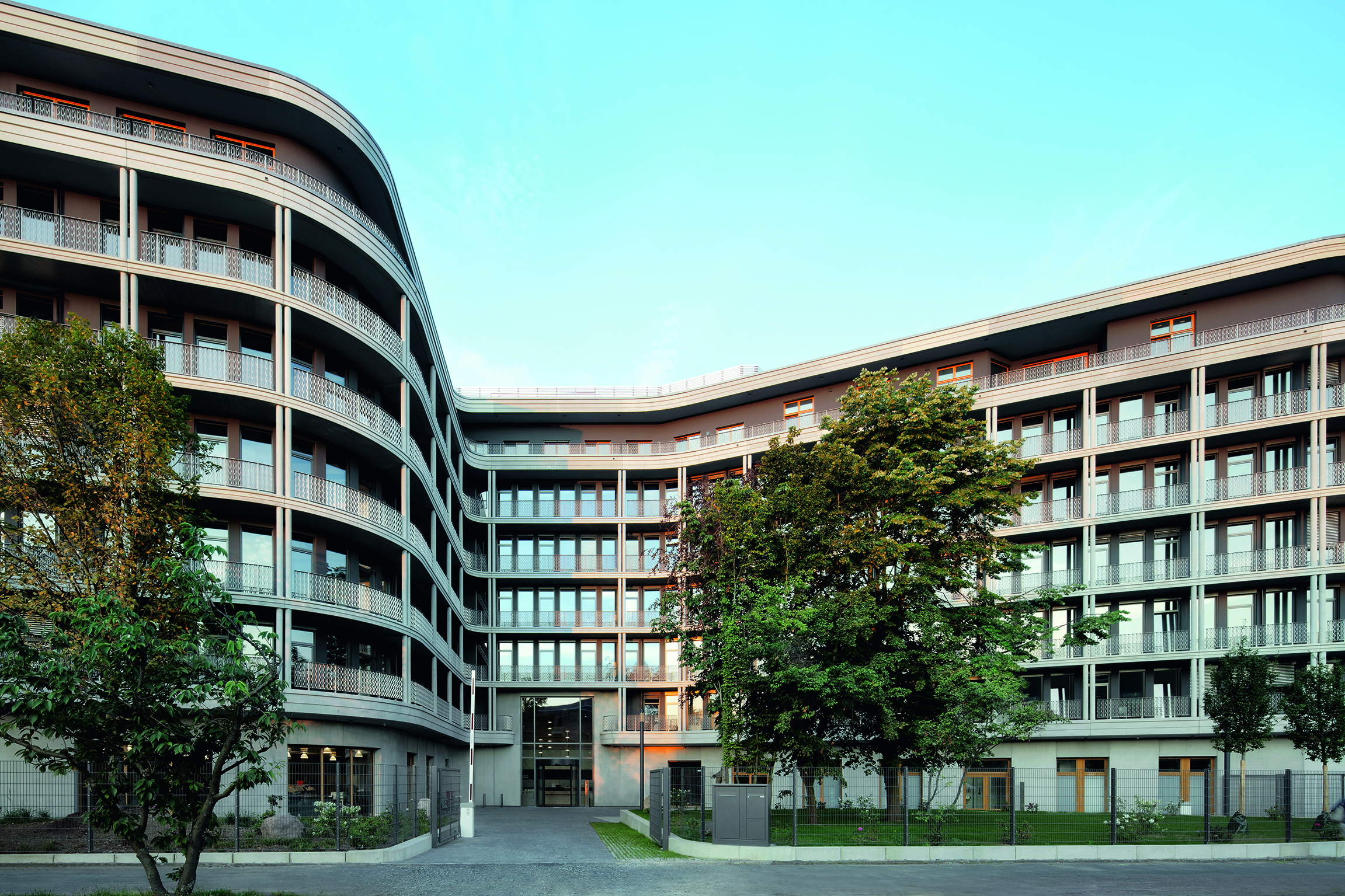 Die Fassade wächst aus einem Sichtbetonsockel heraus. Darüber sitzen Laubengänge. Filigrane Sichtbeton-Doppelstützen gliedern die Außenräume in kleinere Loggien-Einheiten.