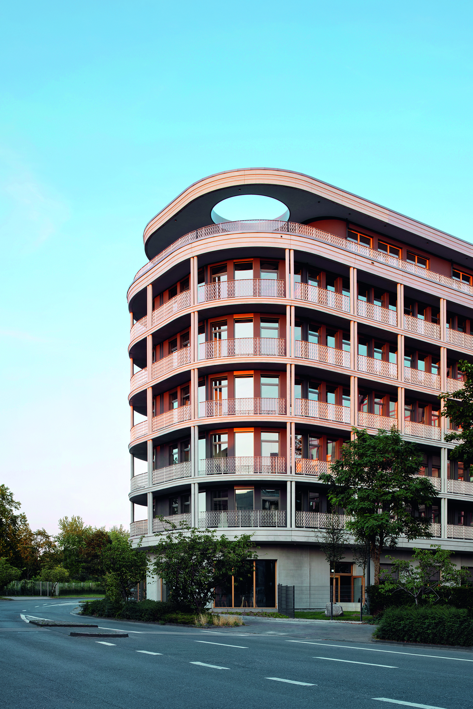 Die Absturzsicherung besteht aus gefalteten Edelstahlblechen mit eingelasertem Rautenmuster. Es unterstreicht die Leichtigkeit der wellenförmigen Gebäudekubatur.