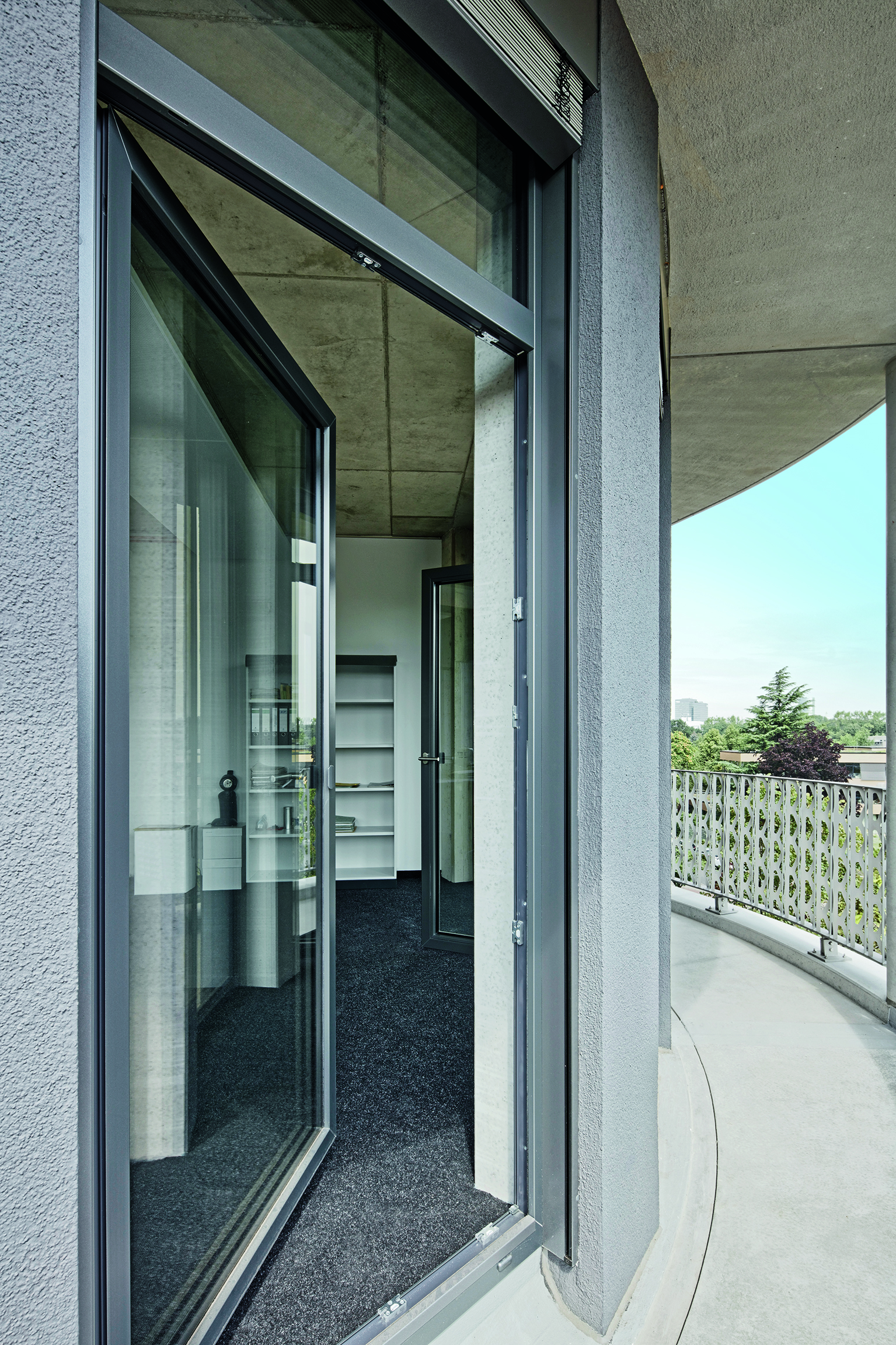 Im K8 hat jedes Büro einen Zugang ins Freie zu den umlaufenden Laubengängen über bodentiefe Schüco Fenster aus Kunststoff. Hoher Tageslichteinfall und eine natürliche Belüftung sorgen für ein angenehmes Arbeiten. Alle Profile erhielten ein dunkelgraues Metallic-Design.