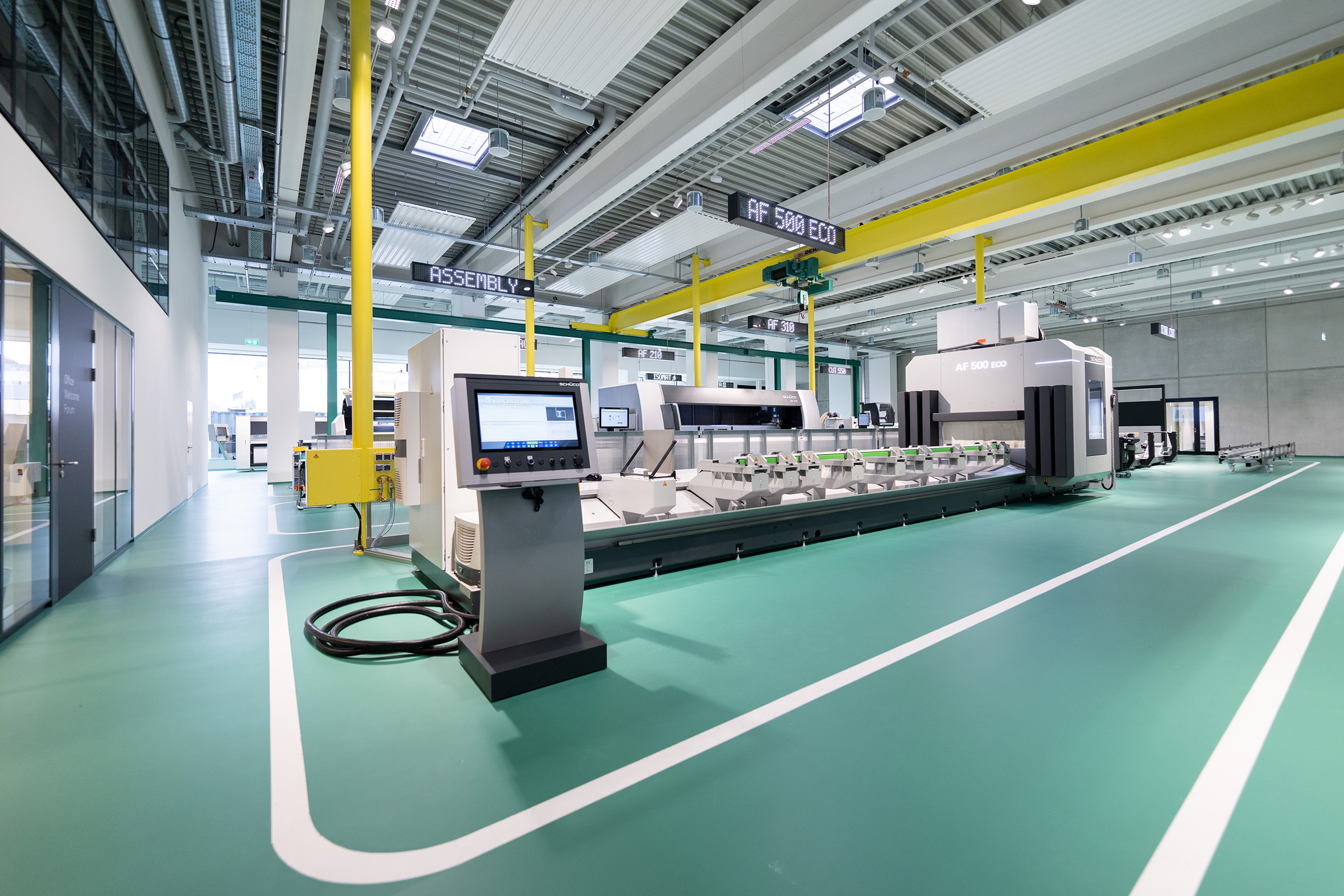 Die Fünf-Achsen-CNC-Maschine Schüco AF 500 ECO vereint die Produktionsschritte Zuschnitt und Bearbeitung mit einem innovativen ökologischen Konzept.