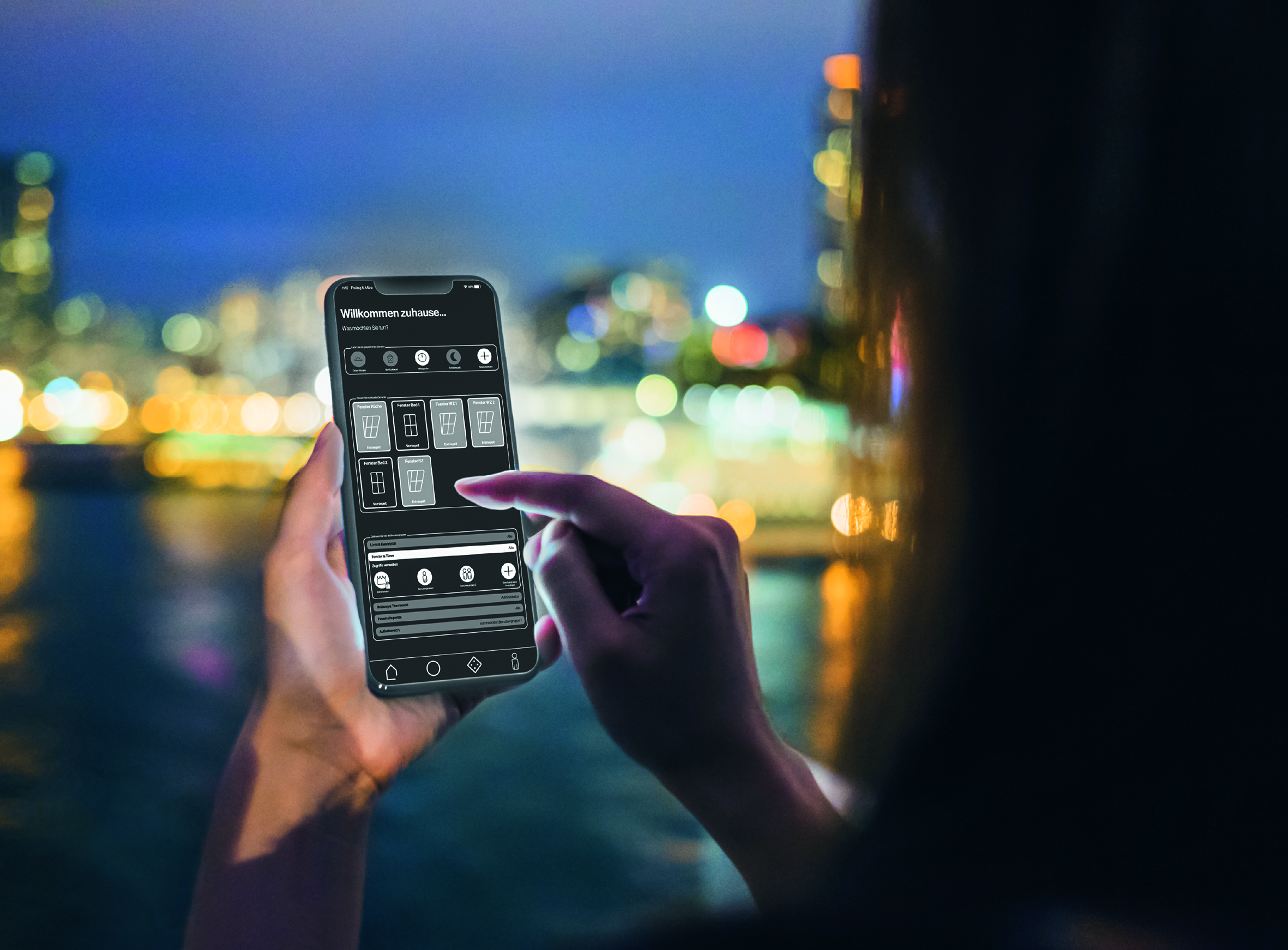 Via Schüco App lässt sich mit dem DCS SmartTouch auch unterwegs die Tür öffnen und mit einer Person vor der Tür kommunizieren.