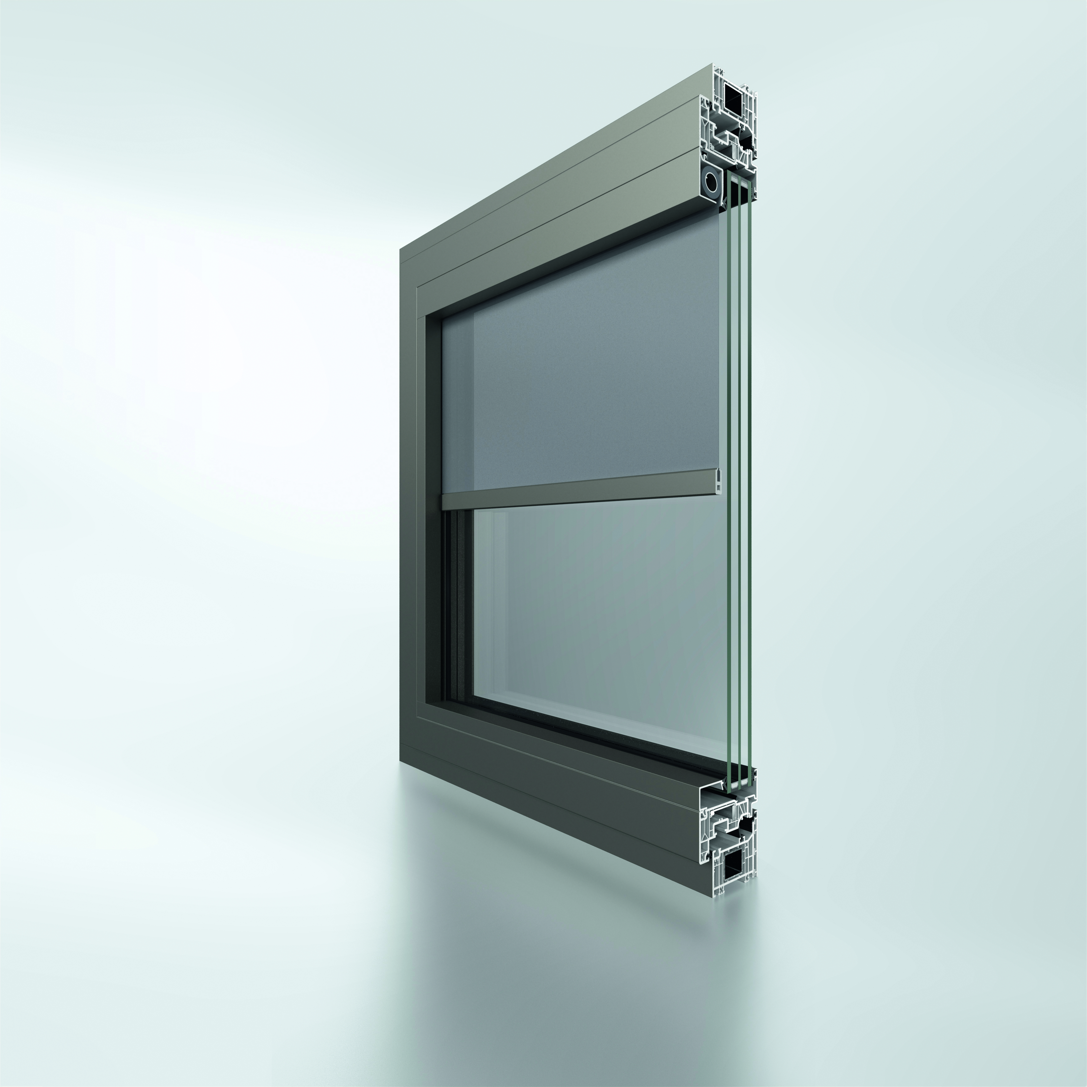 Innen liegender Sonnenschutz, der komplett in der Glasleiste verschwindet: Schüco Symbiotic Fenster mit dem Schüco Integralmaster.