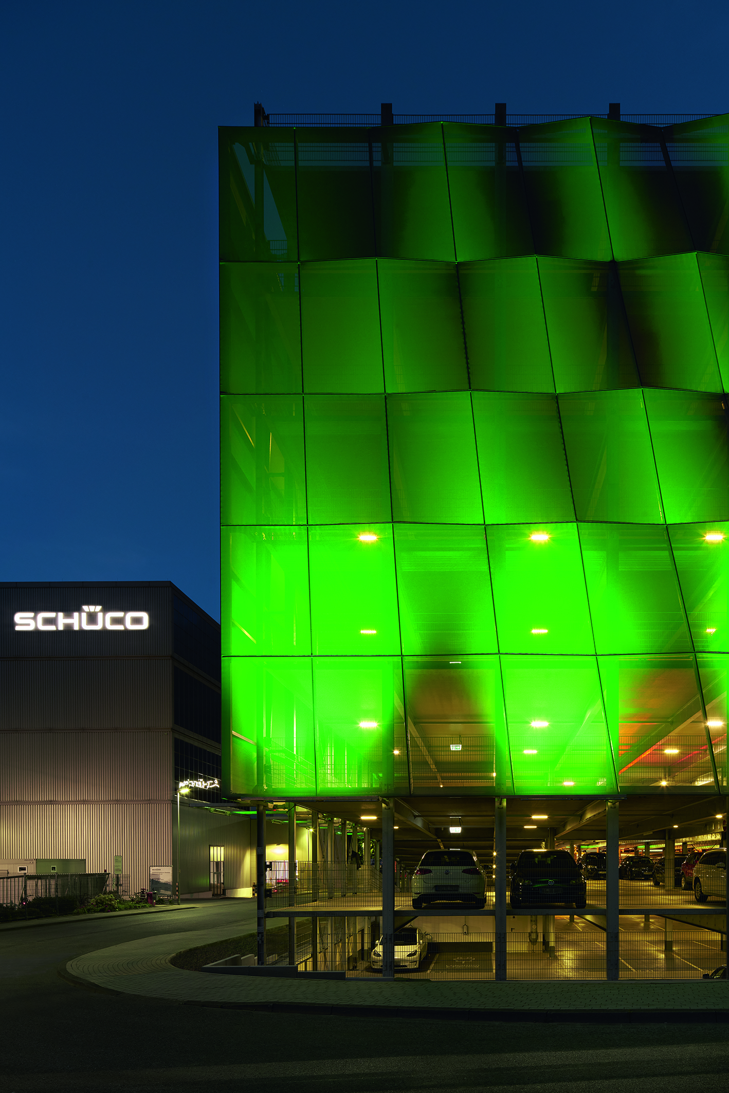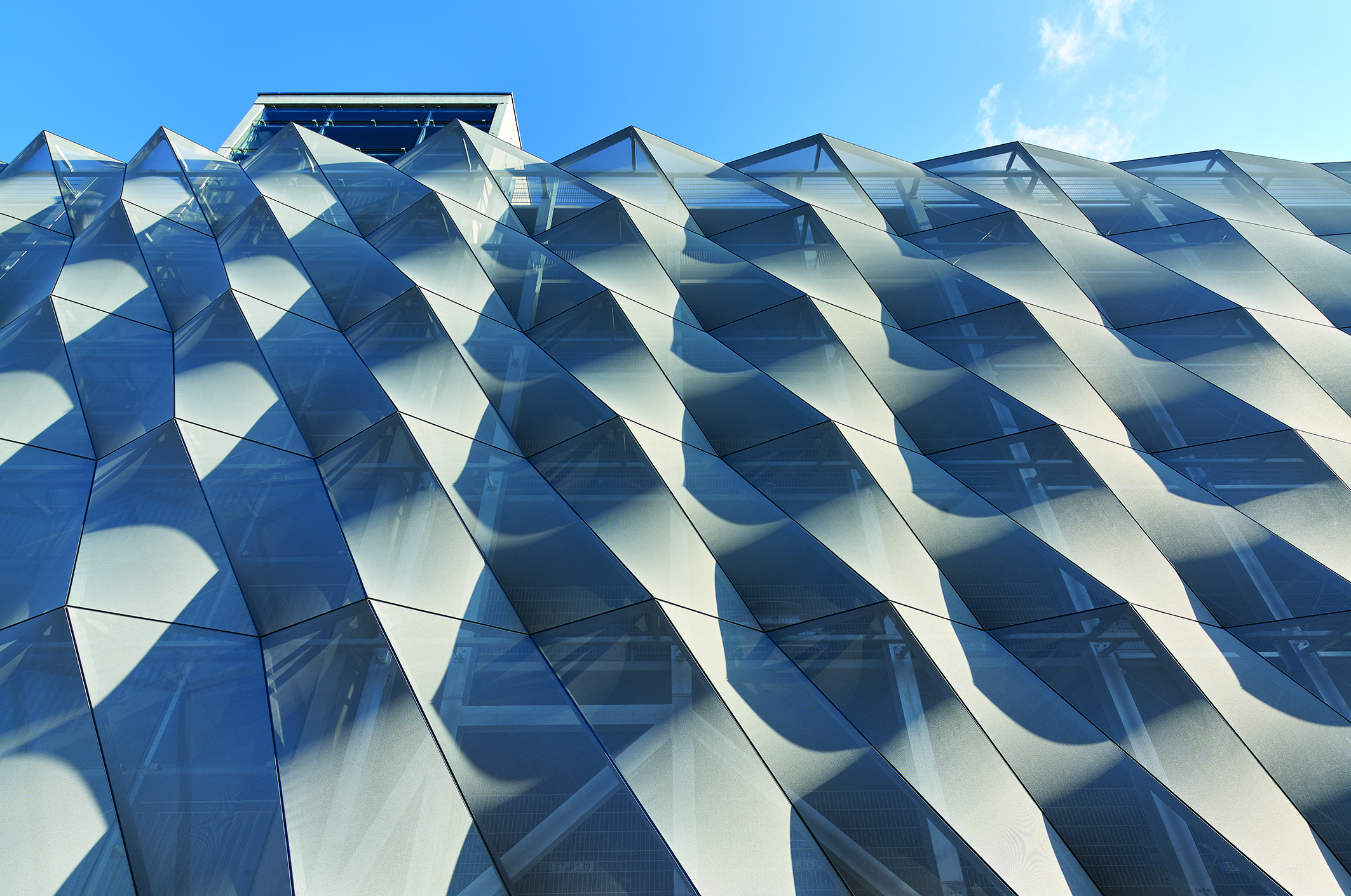 Die große Besonderheit der FACID-Fassade beim Schüco Parkhaus liegt in der Umsetzung des 3D-Effektes. Die individuelle Verdrehung der Teilflächen erzeugt zwei- und dreidimensional formbare Flächen.