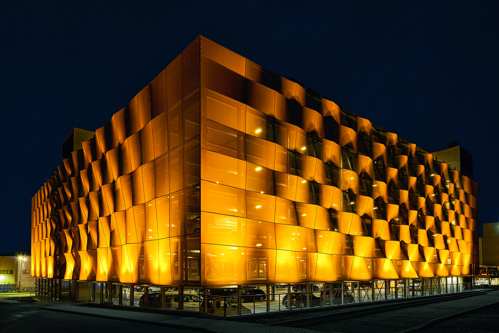 Wie ein schimmernder Kokon legt sich das FACID-Gewebe um den schlichten Kubus des Schüco Parkhauses.
