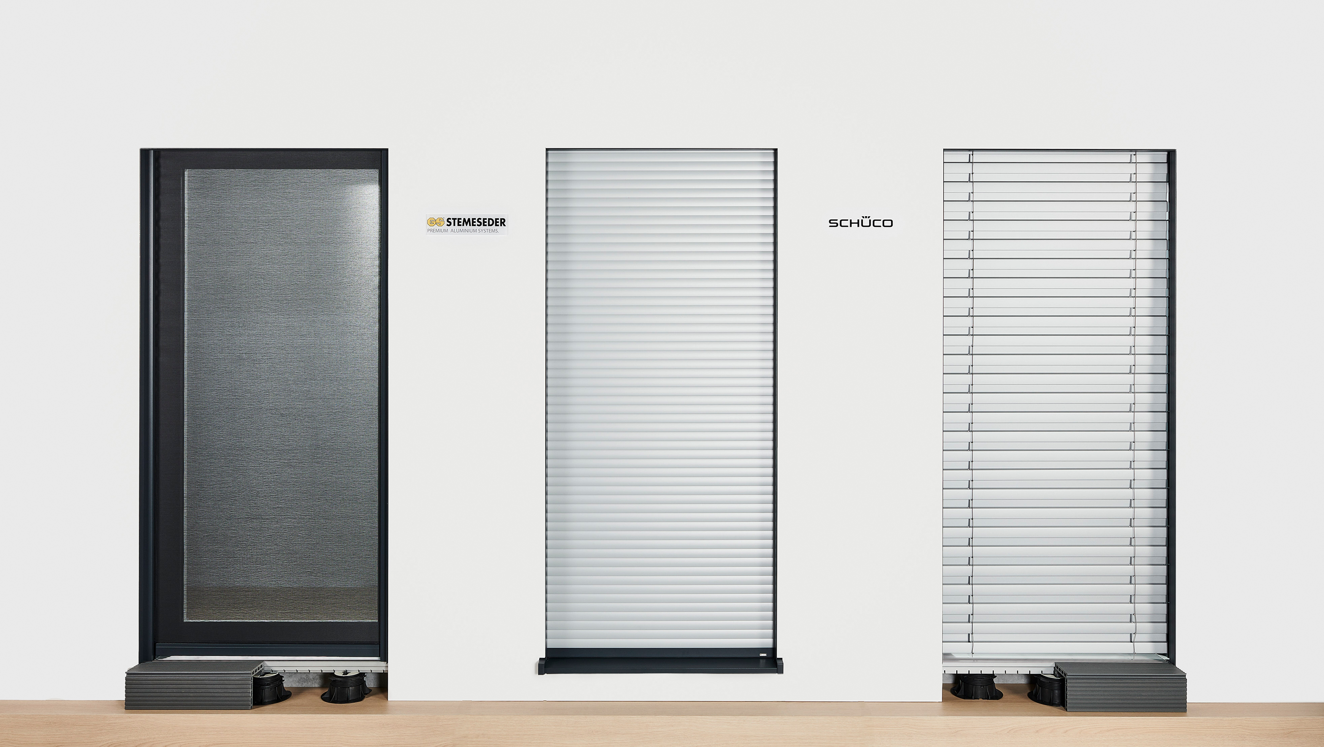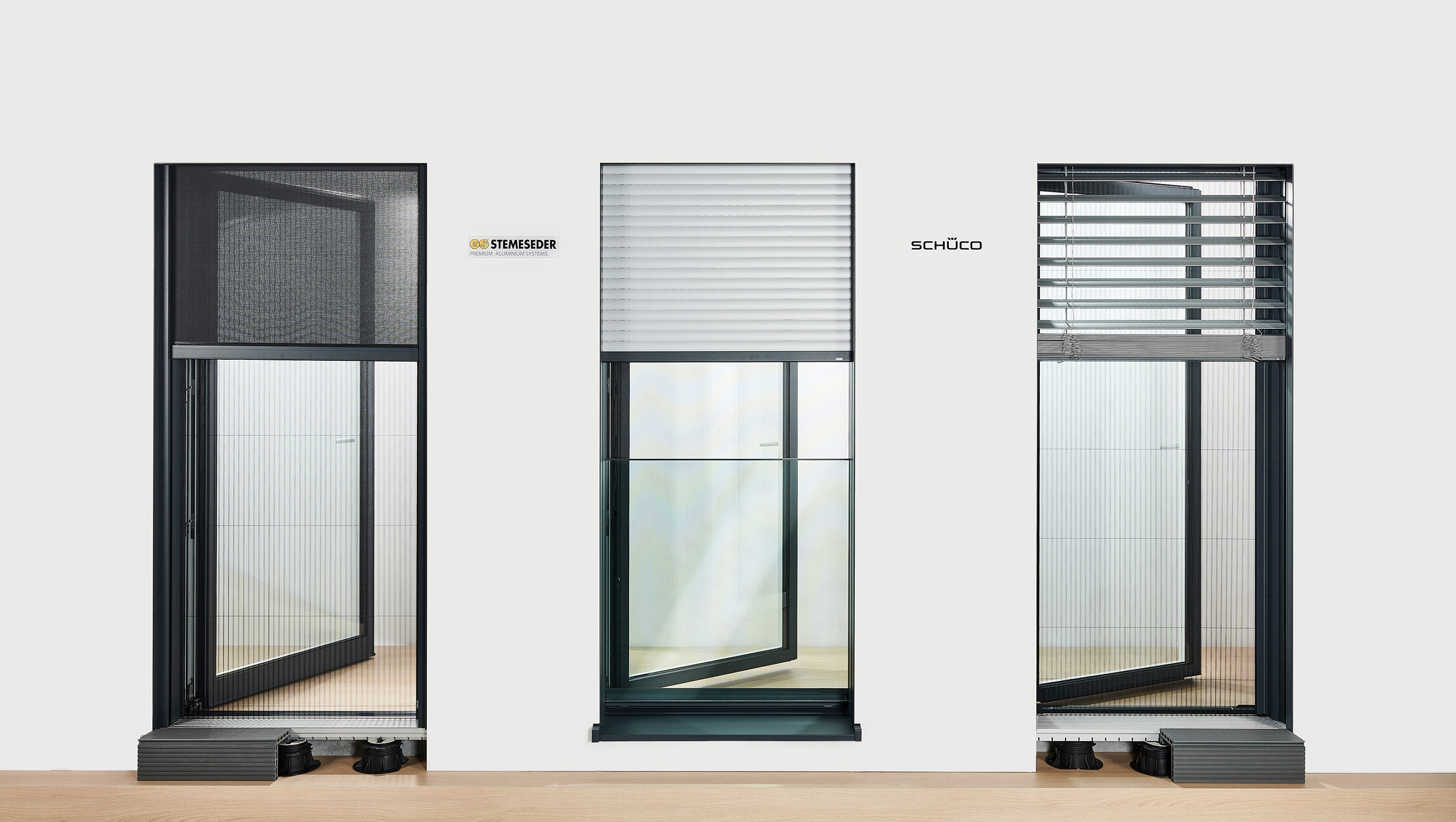 Schüco Perfect (von links nach rechts): Sonnenschutz Zipscreen, Rollladen und Raffstore.