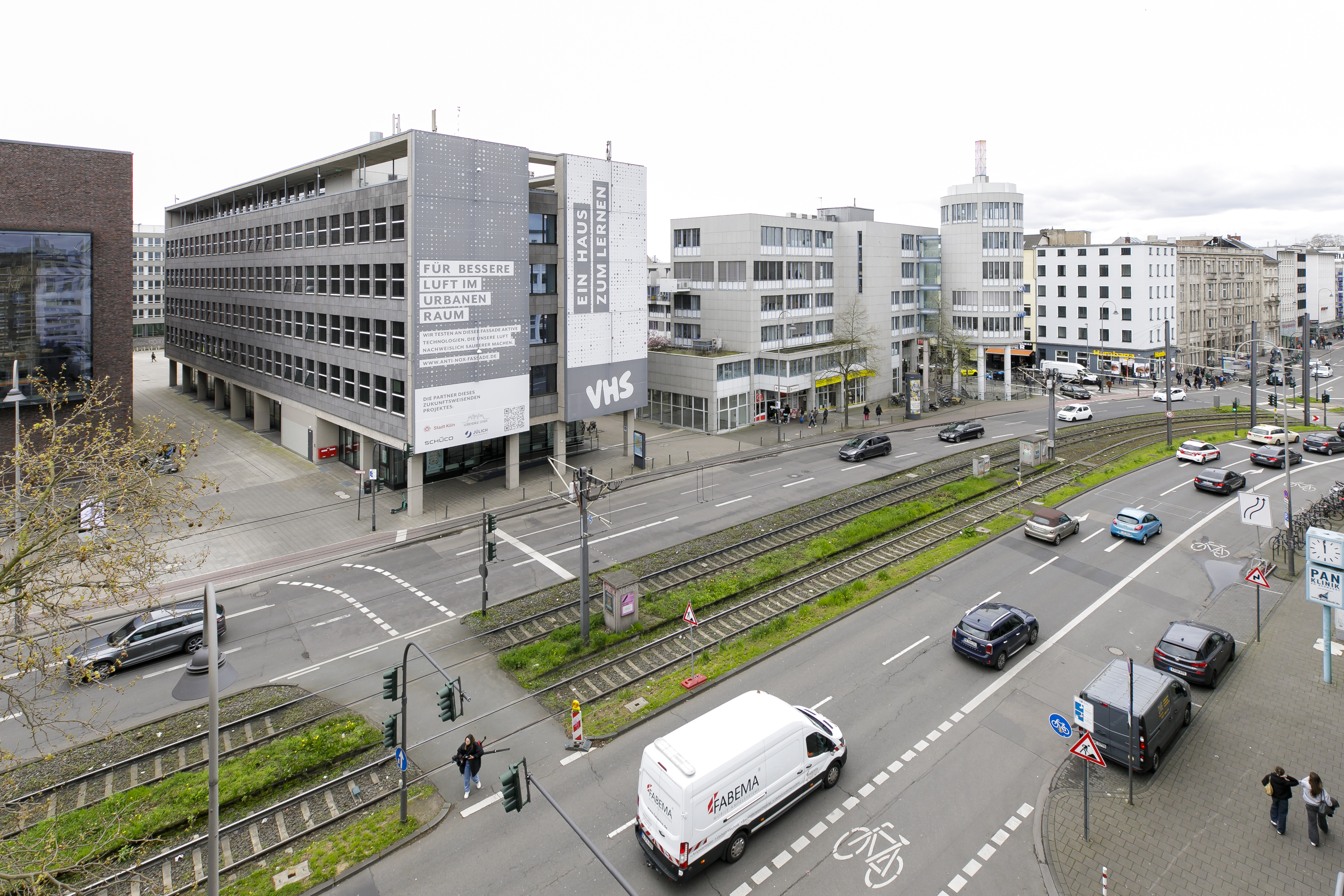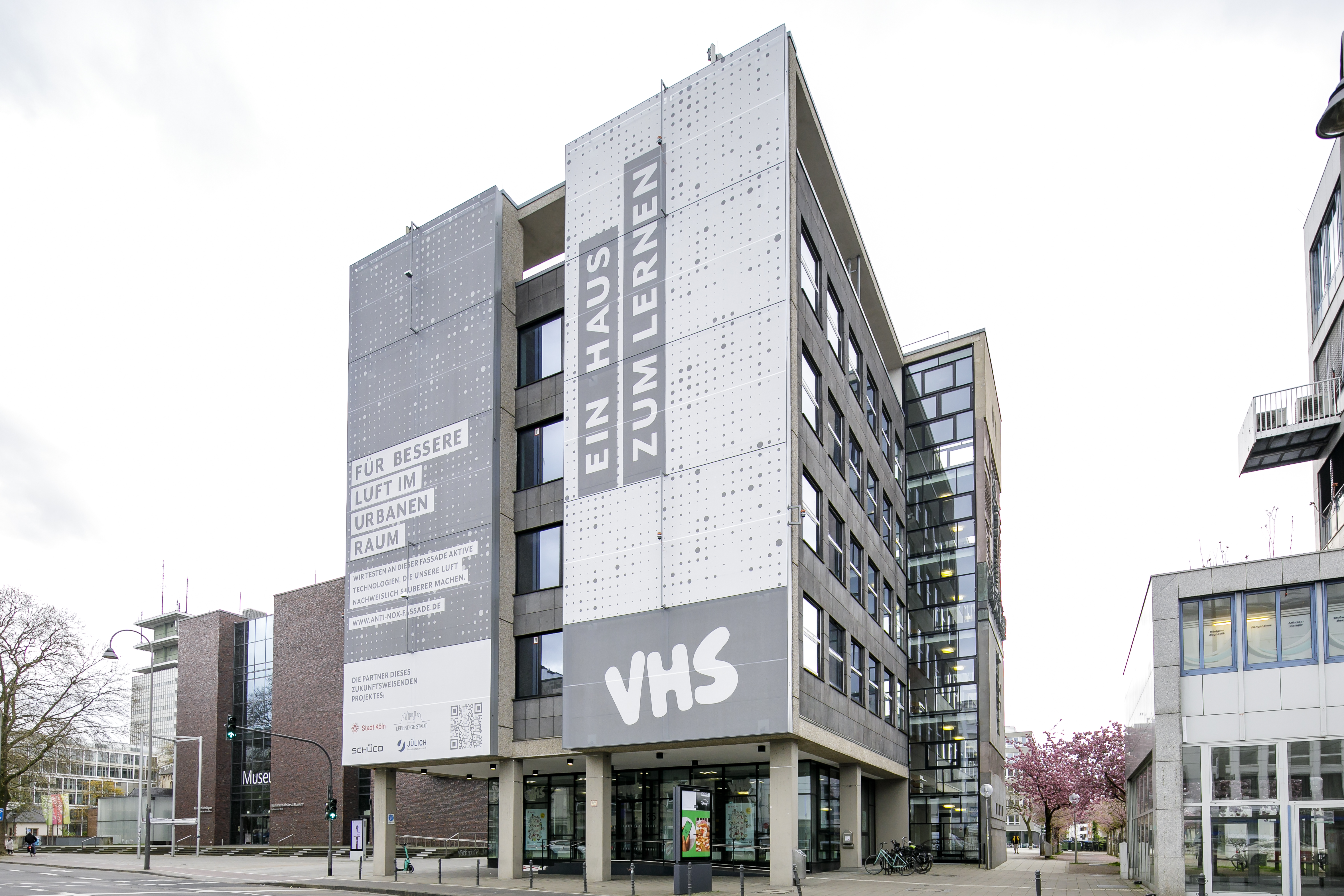 In der Kölner Innenstadt am Gebäude der Volkshochschule die FACID NOX Fassade als Pilotprojekt installiert.