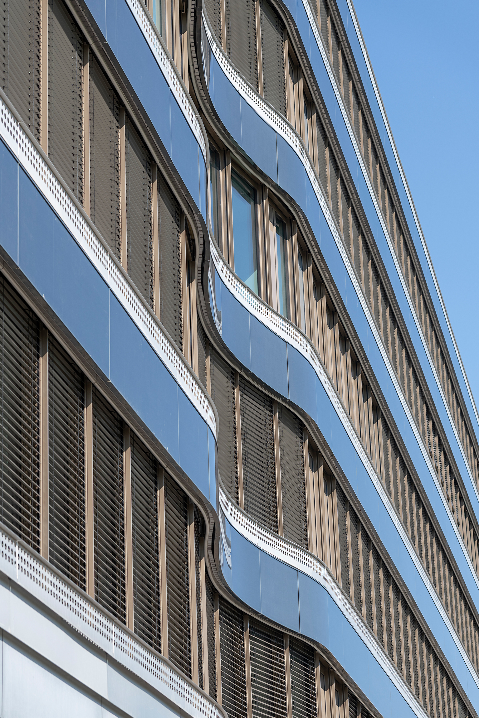 Die umlaufenden Brüstungsverkleidungen aus Aluminiumblech auf Höhe der Zwischendecken sind teilweise mit bauwerksintegrierter Photovoltaik (BIPV) versehen.