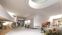 Der vom renommierten Architekturbüro 3XN geplante Neubau wird voraussichtlich 2020 fertiggestellt und dient künftig einem Teil der Schüco Mitarbeiter als neues Quartier. Auf sieben Ebenen mit einer Geschossfläche von 7.200 Quadratmetern entsteht eine zeitgemäße, attraktive Bürolandschaft. Herz des Gebäudes ist das über sämtliche Ebenen helixartig aufsteigende, über eine gläserne Kuppel belichtete Atrium. Eine gläserne Brücke über die im Zuge des Neubaus verlängerte Schücostraße – sie führt nun durch das Gebäude hindurch bis zur Karolinenstraße – bildet den verbindenden Anschluss an die bestehende Unternehmenszentrale. Der Neubau soll die drei Zertifizierungen LEED, BREEAM und DGNB in der höchstmöglichen Kategorie erhalten – als Beleg für weitsichtige Planung, hochwertige Ästhetik, energiesparenden Betrieb und ein ganzheitliches, modernes und zeitgemäßes Arbeitsumfeld. Die ideale Umgebung für die Enstehung von Innovationen, die Schüco erfolgreich in die Zukunft tragen.