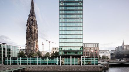 On behalf of the long-standing transport and shipping company Hamburg Süd, the existing listed building designed by Professor Cäsar Pinnau in the 1960s has been extensively refurbished and extended with a new seven-storey office building and a two-storey underground car park with around 120 parking spaces. This task required new floor plan and detailed solutions to comply with modern building and safety regulations. The headquarters of the long-standing shipping company Hamburg Süd was one of the first high-rise buildings in Germany to feature a glass curtain wall and can be seen as an homage to the world-renowned Seagram Building in New York designed by the architect Mies van der Rohe. Although the high-rise building constructed in 1964 has listed status, the existing façade has been completely removed and replaced with a new one. The tower has been stripped back to its loadbearing structure and structurally reinforced. Since the new twin-wall façade extended the width of the high-rise building, another storey has been added on top of the tower. This not only restored the old proportions, but also created valuable additional office space. The façade design is modelled on the proportions of the original façade in order to preserve the elegant aesthetics of the original building designed by Cäsar Pinnau.