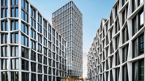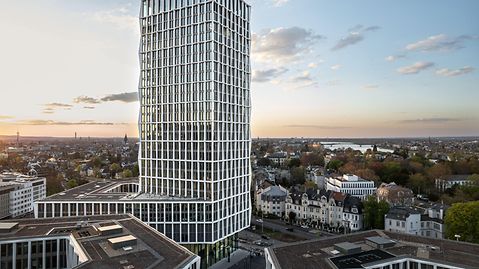 Measuring 100 metres and 28 storeys high, a striking skyscraper rises up out of one of the three base buildings and is visible for miles around. This makes the district home to the third-tallest building in Bonn and offers spectacular views of the city and the Siebengebirge mountain range through its all-round glazing.