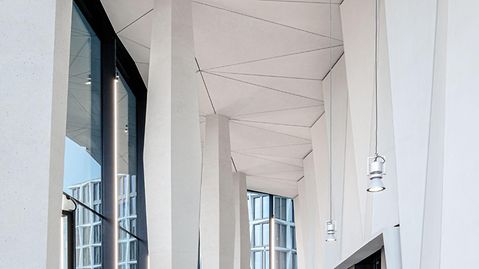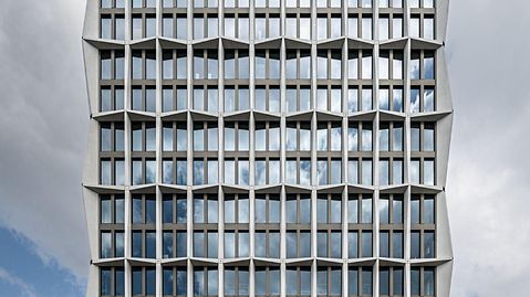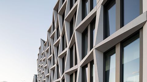 The façade, made from white, acid-washed and double hydrophobic concrete, is the common thread that ties all three buildings together to form a unified whole. The geometries of the façade structure create an ever-changing appearance depending on the viewing angle. The façade was made using a special construction based on the Schüco AWS 75.SI unitised façade, which offers enhanced thermal insulation, security and fabrication.