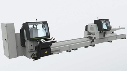 Scie double tête avec lames de 600 mm pour les profilés en aluminium, commandée directement par le système S-cal.