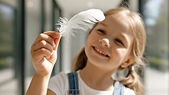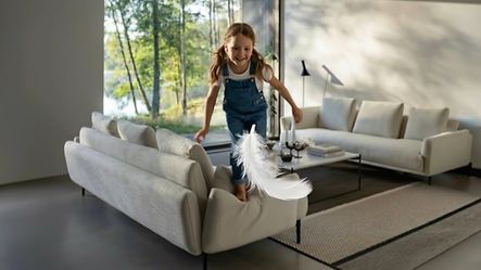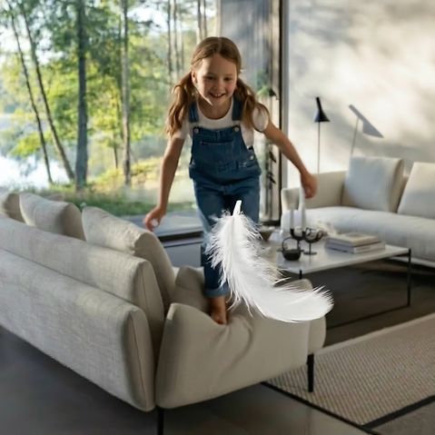 Tout commence par une scène du quotidien, dans une maison au design contemporain. Une enfant s’amuse à sauter sur le canapé… puis une plume s’échappe d’un coussin, et s’envole, comme une invitation à profiter de l’espace.