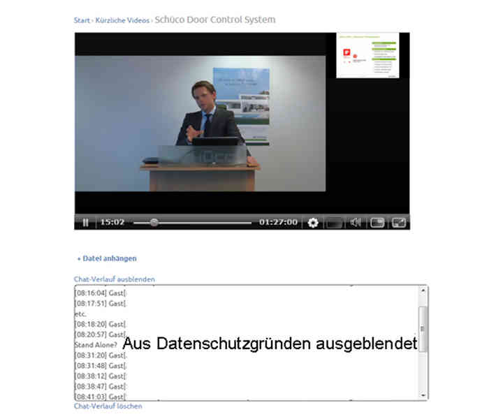 Schüco uses its own "Video Center" (LiveSize) which permits recordings up to full HD. At present, up to 3000 users can access one video stream at the same time. The technology used by Schüco allows both videos and presentation data to be streamed and recorded in parallel. The user can choose between different layouts in a stream.In principle, every event (workshop, training course, presentation, etc.) can be broadcast worldwide – 4 streams are simultaneously generated for different qualities or different end devices (PCs, mobile devices, etc.).The streams, as well as the recording at a later time, can be called up via a simple link.