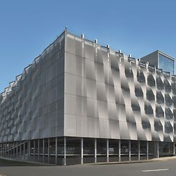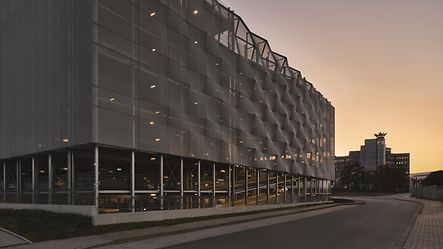 The fabric wraps around the simple cubic structure like a shimmering cocoon. The load-bearing substructure is made from steel and aluminium and gives shape to the envelope. The impression that the building is floating is created by an open base storey, above which the seven upper storeys come together as a single unit – from the flat, homogenous structure with a vertical emphasis, through to the wave-like formation on the side facing the street. By day, the parking levels are bright and flooded with light, benefitting from the transparency of the fabric which allows clear views from inside to outside and of the surroundings, while at night, the appearance changes. When darkness falls, accentuated illumination of the façade and motion-activated interior lighting transform the car park into an illuminated sculpture.