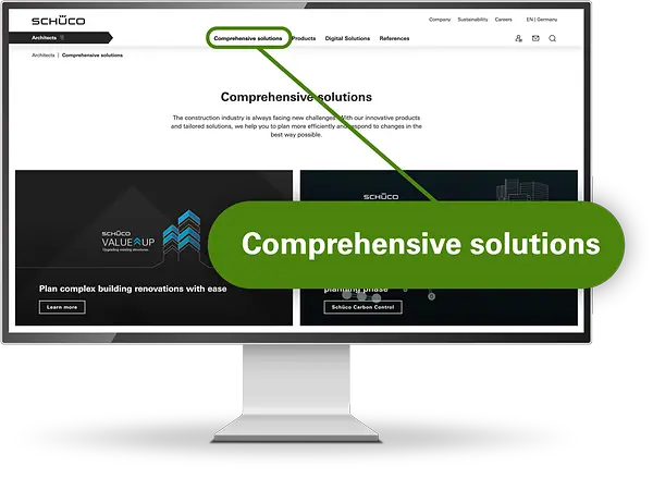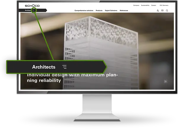 The Schüco website now has a revised structure and a new target group world for you as an architect. This presents the current challenges facing the industry and offers comprehensive solutions from Schüco. Each area is specifically tailored to your needs as a user.