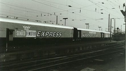1980 The Schüco Express rolls through West Germany from the early 1980s onwards. Inside the carriages of the ultra-modern train, customers can marvel at the latest window and façade technology from Schüco – a unique form of product presentation.