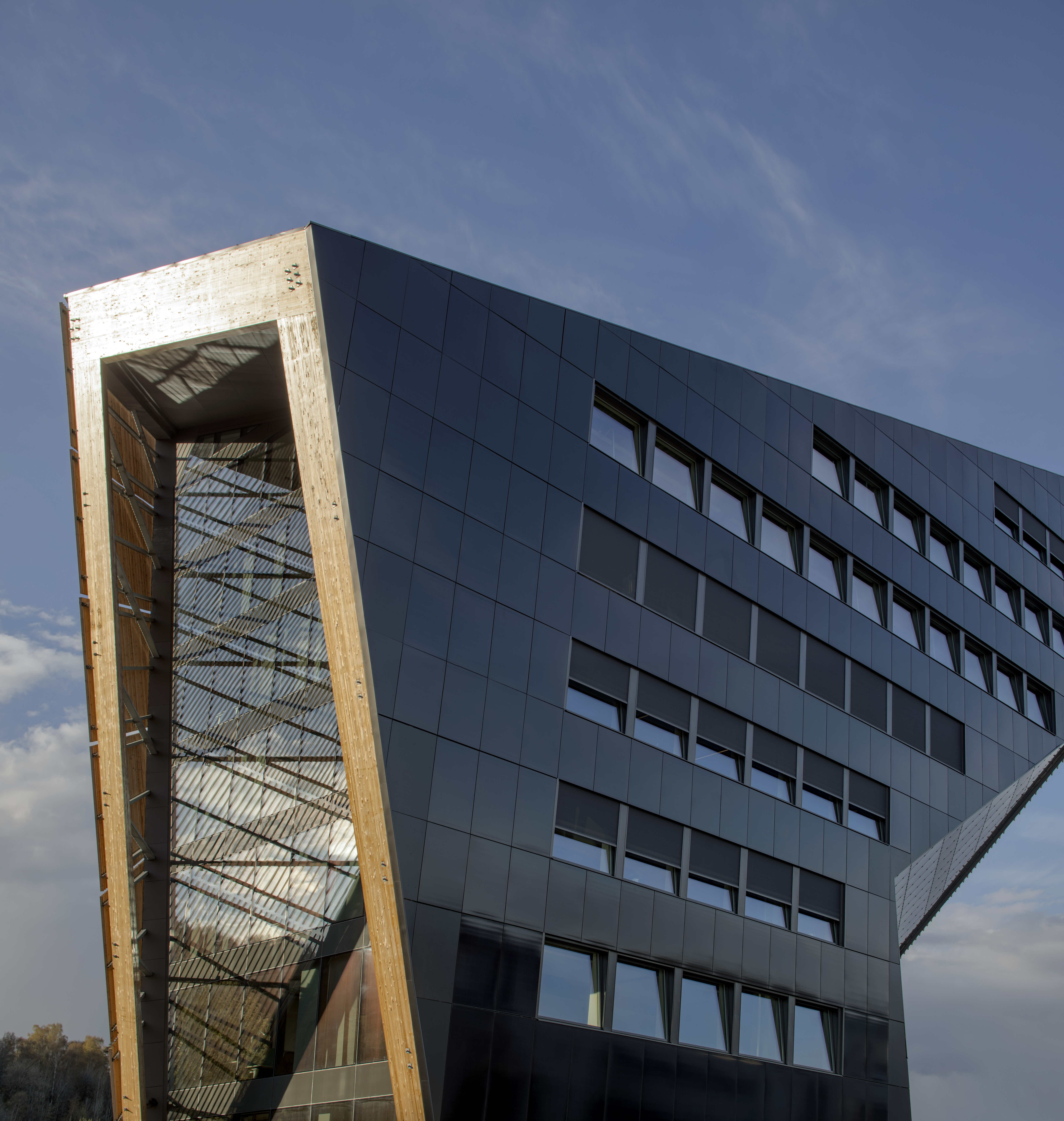 The eleven-storey zero-emissions building lies on the banks of the Skienselva river.