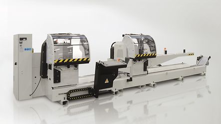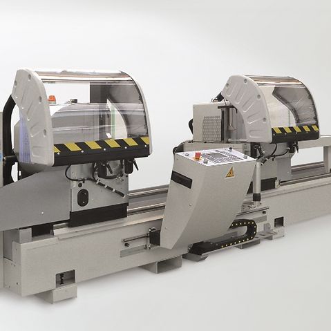 For notching and cutting aluminium profiles. Double-head saw, automatic saw blade feed and fixed profile loading for cutting.