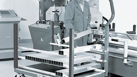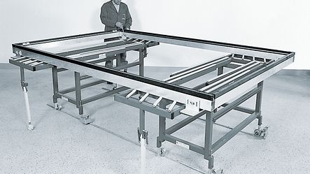 Setting up several tables for facade profiles in a line provides an ideal environment for assembling large units. The tables can be moved easily into position on rails. They can also be moved to one side when not required.