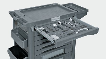 Trolleys for preparing hand tools for metal fabricators with special insert for Schüco tools.