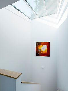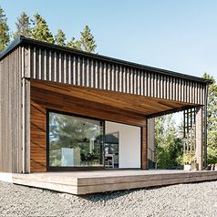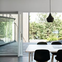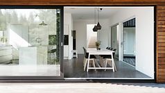 The initial planning discussions took place in a summer cottage, which the family had used for several summers in order to get to know the area. The family wanted a light and airy house that nevertheless provided a sense of safety and seclusion. It was a balancing act, which the architect mastered using a simple cubic construction. Its roof covered with plants and its façade of vertical wooden slats allow the house to blend into the trees behind. Initially concealed from visitors, the house opens up to the rear across two storeys. This creates a private outdoor space which provides a sheltered view of the lake and the evening sun. Large-format sliding units dissolve the boundaries between indoors and outdoors. The house can be opened up completely on sunny days while, in the winter, the doors remain closed and the family stays warm. Just like picture mounts, the Schüco systems frame the highlight of the villa: the undisturbed view of nature.