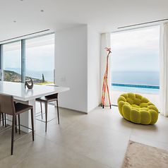 This is exactly the case at the villa on the Ionian island of Zakynthos. However, this building cannot be confused with a church or farmhouse, even from afar. It is a villa with two levels on a narrow plateau upon a hilltop, with breathtaking views of the Ionian Sea. White plastered areas, large-format glazing and a natural stone wall as the backbone connect the solid construction with the lightness and elegance of the modern architecture. Room-height glazing using profiles with minimal face widths and no disruptive handles enable a maximum field of vision, from the sleeping and living areas, and the bathrooms. The new villa comes alive through the interplay of light and shadow. The pergolas provide both sun shading and screening. The sliding doors from Schüco allow the indoors and outdoors to merge, giving the residents a feeling of freedom. This continues throughout the year, as the villa is also designed as a place to retreat in winter. The architect therefore put a particular focus on thermal insulation and sound reduction, opting for a Schüco Panorama Design sliding door. An underfloor system provides additional comfort by heating up in the winter and cooling down in the summer.