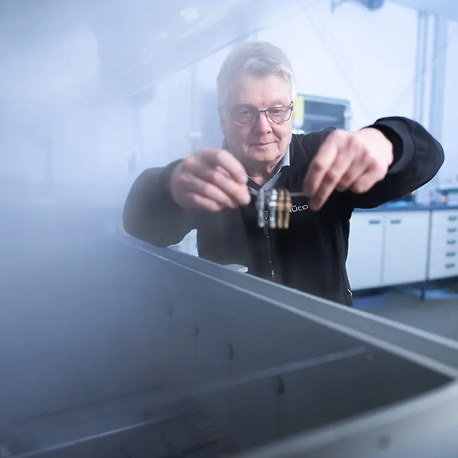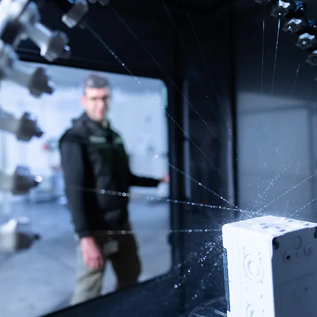 Oltre alle prove statiche e dinamiche di pressione, trazione e flessione, vengono testate anche le prestazioni meccaniche dei profili con taglio termico. Le verifiche si svolgono sia a temperatura ambiente, sia in condizioni climatiche controllate, da –20°C fino a +80°C. L’invecchiamento dei campioni viene inoltre analizzato applicando pesi e temperature definite per 1.000 ore consecutive.