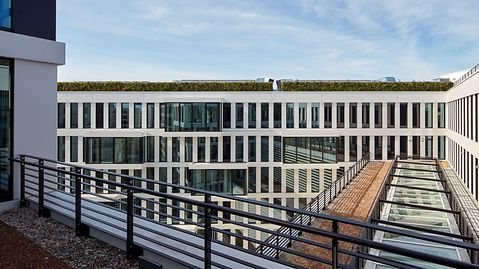 The newbuild was designed in accordance with the principles of the "Cradle to Cradle" (C2C) concept and received the DGNB Gold certificate. The building includes C2C-certified Schüco windows and façade systems. The concrete floors consist of a BubbleDeck flooring system which is filled with recycled plastic balls in order to save concrete, make the structure lighter and thereby reduce carbon emissions. Other components, such as the sound reduction walls, paint and carpets are also C2C-certified.
