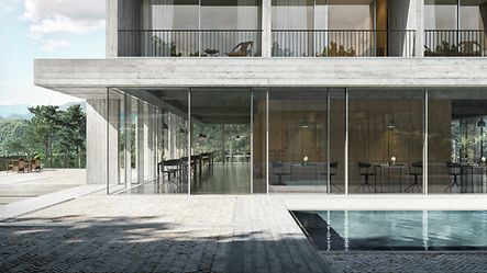室内からの眺めは何からも遮られることがありません。パノラマ デザインのスライディング ユニットにより、Schücoは自然や都市の眺望と可視性を最大化します。