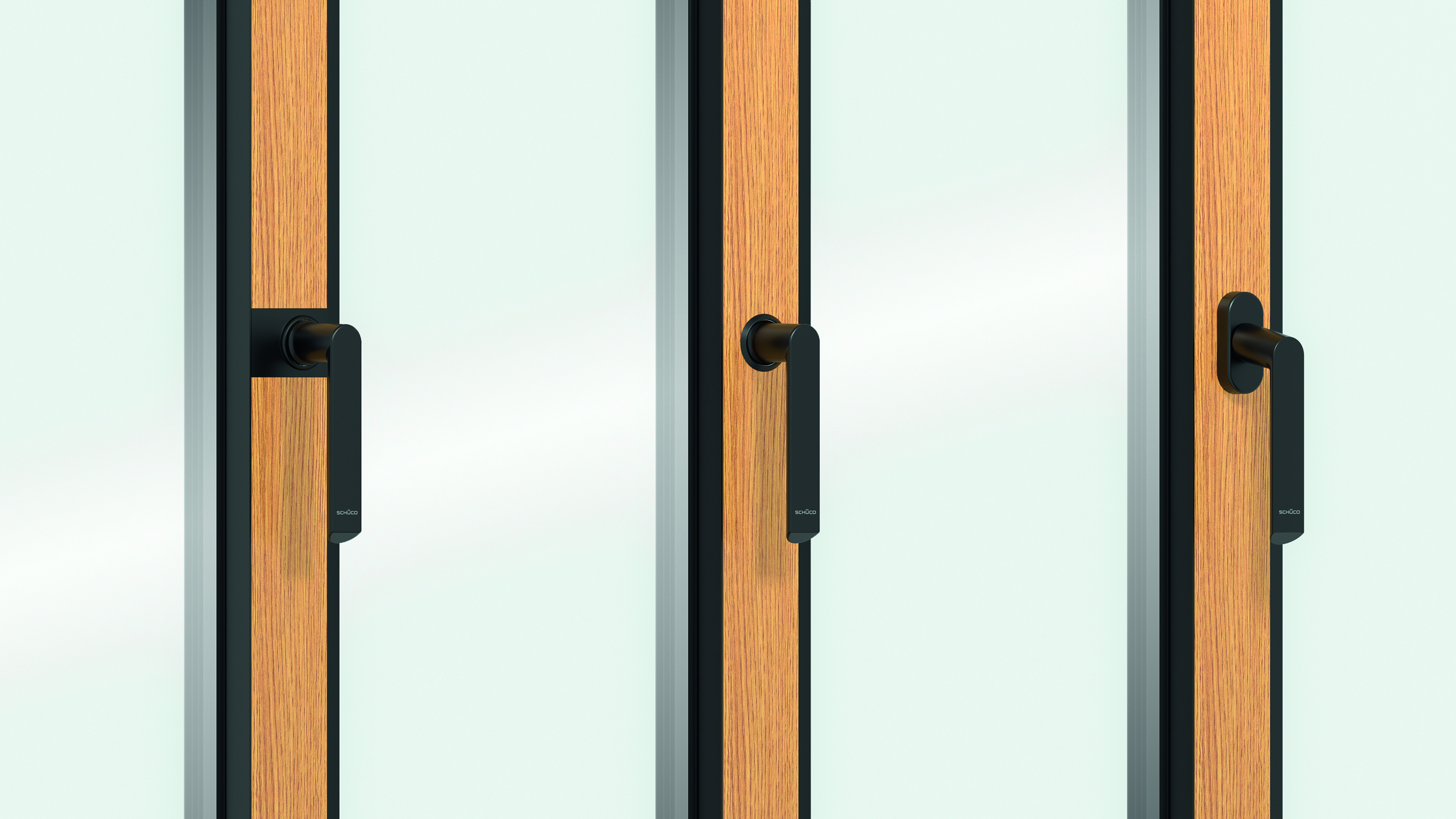 The range of handles for Schüco AWS WoodDesign includes push-in handles with a rectangular rosette, push-in handles with a round rosette and a window handle with an oval rosette, all in the basic colours of black and white as well as a stainless steel look.