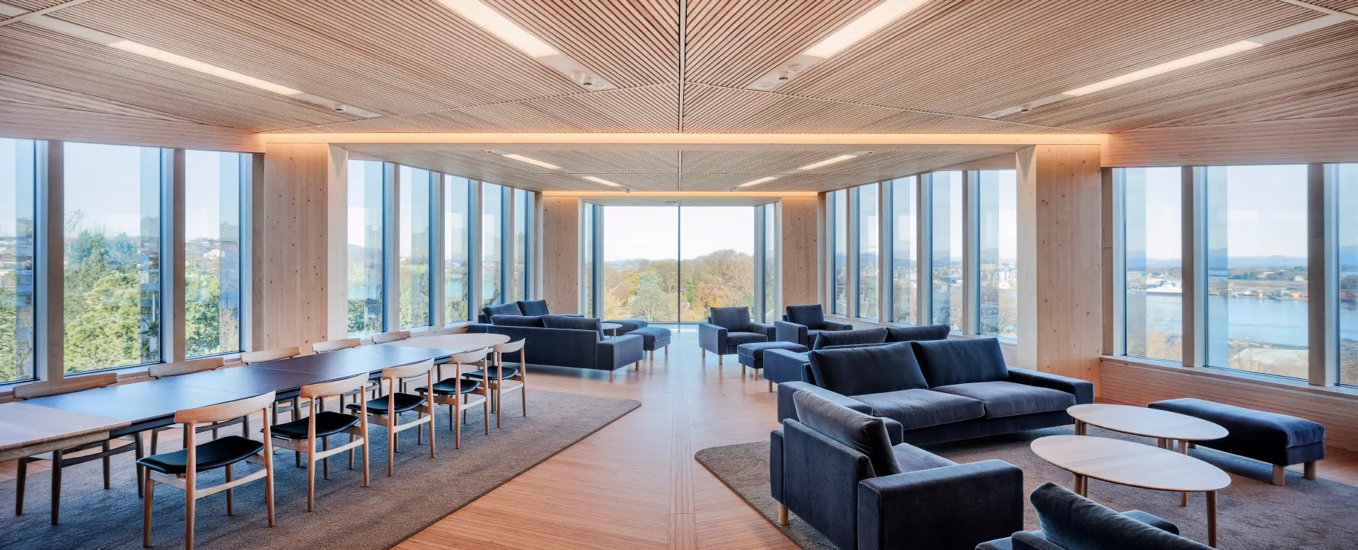 For the »Bjergsted Finansparken« newbuild, the headquarters for SpareBank in Stavanger in south Norway, Helen & Hard collaborated with SAAHA to create an exciting hybrid construction and an icon of contemporary timber architecture. What's special about this building is that the structure, which is made predominantly out of timber, is clad in a classic, geometric Schüco mullion/transom glass façade to contrast with the warm, organically formed wood interior of the complex.