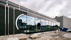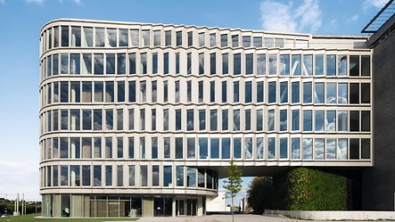 The transparent plinth on the ground floor consists of various Schüco façade systems. The FWS 50 mullion/transom façade with the highest thermal insulation properties was used in the curved areas as well as in front of the rooms on the east side, while the FWS 35 PD Panorama Design façade was used on the flat areas next to the main entrance.