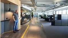 The changes on the inside are more than just construction measures. The new architecture in Digital Hub One has created a completely new working culture, a different way of working together. 159 fixed and many temporary workstations have been created on the ground floor and on the two full upper levels. The overall area of the building has been divided into zones in order to meet various different working requirements. Both dynamic teamwork and quiet, concentrated work are equally possible. To achieve this, open working spaces alternate with glazed but closed meeting areas, telephone booths and whiteboard nooks.