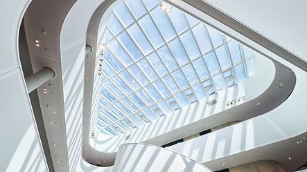 The glass roof of the atrium can be individually darkened thanks to the switchable, electrochromic glass, ensuring a pleasant temperature and glare protection inside the building all year round – without impeding the view outside. This further improves energy efficiency and user comfort – for sustainable and sophisticated architecture.