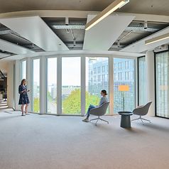 Minimal face widths on the window system AWS 75 PD.SI also allow light to flood into the offices. The system combines maximum transparency with excellent insulation properties, and is therefore the basis for healthy light levels in the office and contributes towards making the building energy-efficient.
