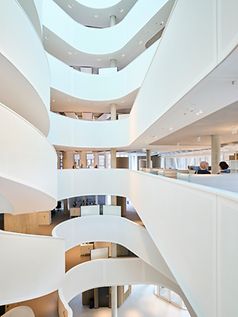 The aim of the architects is to create spaces in all areas of the building which encourage people to communicate and exchange knowledge. There are therefore deliberately no corridors in the building: colleagues move in a loop around the central atrium, creating a continuous flow without any dead ends.