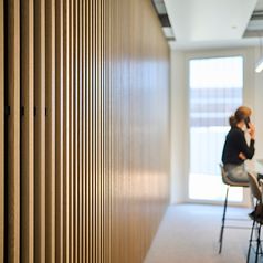 The AF UDC 80 unitised façade gives the building a modern and timeless aesthetic. The AB ZDS textile sun shading which is integrated into the façade can be manually lowered when needed, enabling individual offices to be shaded and ensuring a comfortable room temperature. And what makes this sun shading so special is that it is integrated seamlessly in the façade, so that it cannot be seen from outside when retracted.