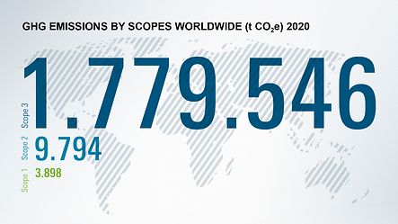 Due to the Covid-19 pandemic, the opposite trend was observed in 2020, with work travel by field sales staff (Scope 1) and business trips and kilometres travelled (Scope 3) having significantly decreased. This resulted in Scope 1 emissions being reduced by 10% to approx. 9800 t CO2e and Scope 3 emissions by almost 6% to 1,780,000 t CO2e. The Scope 2 emissions also went down, albeit by only 0.3% to approx. 3900 t CO2e. The total emissions from all three Scopes for 2020 total 1,793,238 t CO2e, which is 5.8% lower than 2019.