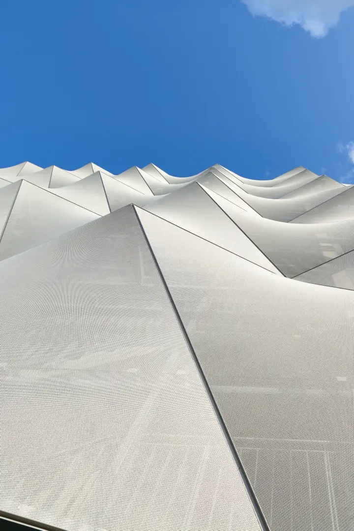 상하이에서는 파사드 뒤에서 효과적인 차양과 열 취득 감소를 분명히 볼 수 있었습니다. 파시드는 최대의 투명성과 환기를 보장하면서 이러한 보호 수준을 달성합니다. 벽 앞에 있는 팽팽한 텍스타일 파사드는 관찰자에게 깊이 효과를 줍니다. 그 결과 파사드 뒤의 구조가 지속적으로 보이는 반투명한 외관을 갖게 됩니다.