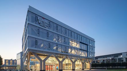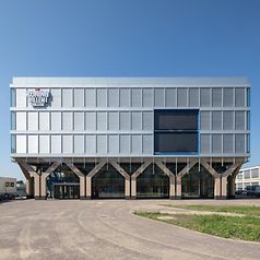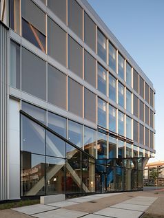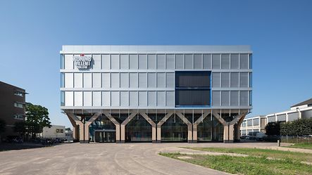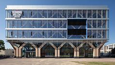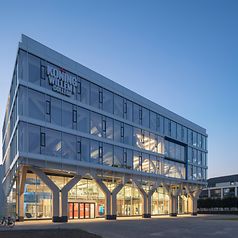 건축 실무 Nieuwe Architecten은 2017년 프로젝트 계획을 위임 받았습니다. 지속 가능한 재료로 현대적이고 적응 가능한 신축 건물에 대한 고객의 희망에 따라 5개 층과 추가 지붕 층으로 구성된 컴팩트한 볼륨이 만들어졌습니다, 또한 이는 동쪽 캠퍼스의 유명한 랜드마크 역할을 합니다. Schüco FWS 50 시스템을 사용하여 구현된 슬림라인 멀리언/트랜섬 파사드는 목재 하중 지지 구조와 밝은 파란색 계단을 보여주는 건축의 두드러진 특징입니다. 앞마당을 향한 메자닌 수준에서 유리 외피는 하중 지지 구조 바로 뒤에 설정되어 입구 영역에 개방형 아케이드를 만듭니다.