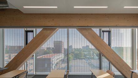 Roderik van der Meulen은 "외부 차양을 선택하기로 한 결정으로 파사드 디자인이 대체로 투명해지고 내부 목재 구조가 주변 환경에서 계속 눈에 띄게 되었습니다."라고 설명합니다. "건축물을 중앙에 배치하고 전면부에 통합할 수 있는 패어백 외관을 갖춘 강력한 시도 및 테스트를 거친 시스템을 원하는 고객의 요구를 바탕으로 당사는 곧 시장에 출시된 유일한 통합 시스템인 Schüco의 CSB 시스템을 발견했습니다. 즉, 테스트 구성에서 시스템을 검사하고 시스템의 전체 높이와 깊이를 중간 층의 치수에 맞게 조정하는 것이 특히 중요했습니다."