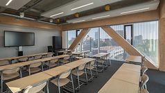 공기가 잘 통하는 실내 디자인은 전통적인 교실에서 오픈 플랜식 학습 환경으로 흐르는 듯한 전환과 마찬가지로 인상적입니다. 건물 전체에 걸쳐 있는 기존의 8 x 8m 그리드는 언제든지 현재 요구 사항에 맞게 4m 높이 층을 유연하게 조정할 수 있습니다. 신축 건물을 기존 건물에 연결하기 위해 기획자는 슬림한 연결 블록과 주름진 파사드와 바람이 잘 통하는 톱니 지붕 구조가 있는 3층 높이의 아트리움도 추가했습니다.