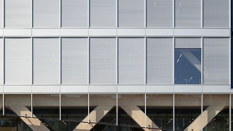 슬림라인 루브르 블레이드 디자인 덕분에 건물의 건축과 매끄럽게 조화를 이루는 외부 Schüco CSB 차양 시스템도 신조의 기후 컨셉에서 중요한 역할을 합니다. 이 자동 작동 시스템은 1층 위의 Schüco FWS 50 파사드 시스템에 완전히 통합되어 있으므로 차양 헤드박스가 필요하지 않습니다.
