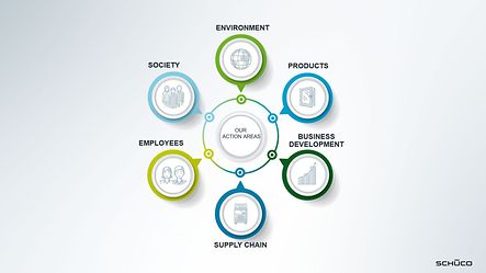지속 가능성은 기후 및 환경 보호를 넘어섭니다. 우리는 그것을 전면적인 도전으로 보고 있습니다. 그러므로 우리가 마음대로 사용할 수 있는 것을 사용하여 모든 영역에서 양심적으로 행동하는 것이 우리의 의무입니다. 지속 가능성은 추상적인 개념이 아니라 환경, 제품, 비즈니스 개발, 공급망, 직원 및 사회의 여섯 가지 정의된 행동 영역을 통해 매일 다루고 있는 의제의 구체적인 항목입니다. 한 번에 모든 것을 할 수 없기 때문에 Schüco 지속 가능성 초점 포인트를 더욱 좁히고 현재 우리의 주요 초점인 작업 영역 외에 6개의 프로젝트를 정의했습니다. 여기서 우리는 이러한 중점 프로젝트 중 하나에 각 작업 영역을 할당했습니다.