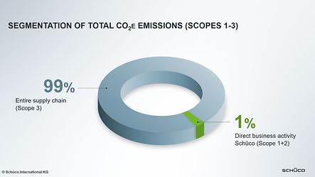 Schüco가 2040년까지 달성하고자 하는 CO2 등가물의 절감은 Scopes(범위)라고 알려진 세 가지 영역과 관련이 있습니다. 간단히 말해서, Scope 1은 우리 자신이 Schüco에서 에너지 소비를 통해 생산하는 배출물과 관련이 있습니다. Scope 2는 우리가 사용하는 에너지, 예를 들어 조명이나 IT 하드웨어에 필요한 전기와 관련이 있습니다. Scope 3은 가장 까다로운 영역이며 제품의 전체 라이프사이클을 다룹니다. 여기에는 당사 제품의 제조, 사용 및 폐기뿐만 아니라 전체 공급망이 포함됩니다. 배출량의 99%는 범위 3에 해당하며, 그 중 86%는 구매한 상품 및 서비스입니다. 이는 Schüco가 배출량의 극히 일부에 대해서만 직접적인 영향력을 행사하고 있으며, 기후 보호 목표는 공급업체와 매우 긴밀한 협력을 통해서만 달성할 수 있다는 것을 의미합니다.